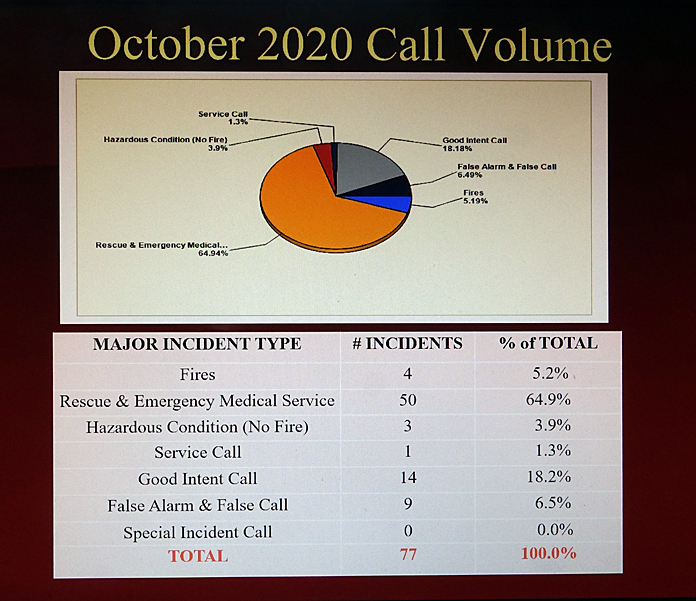 The current weather has slowed activity down, but the District has responded to 77 callouts in October with 65 percent of those calls related to emergency medical services. “There have been no major incidents in October.” There was also no fire loss in October.