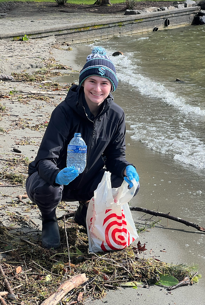 Anna Galipeau collecting trash on a Lake Chelan beach.